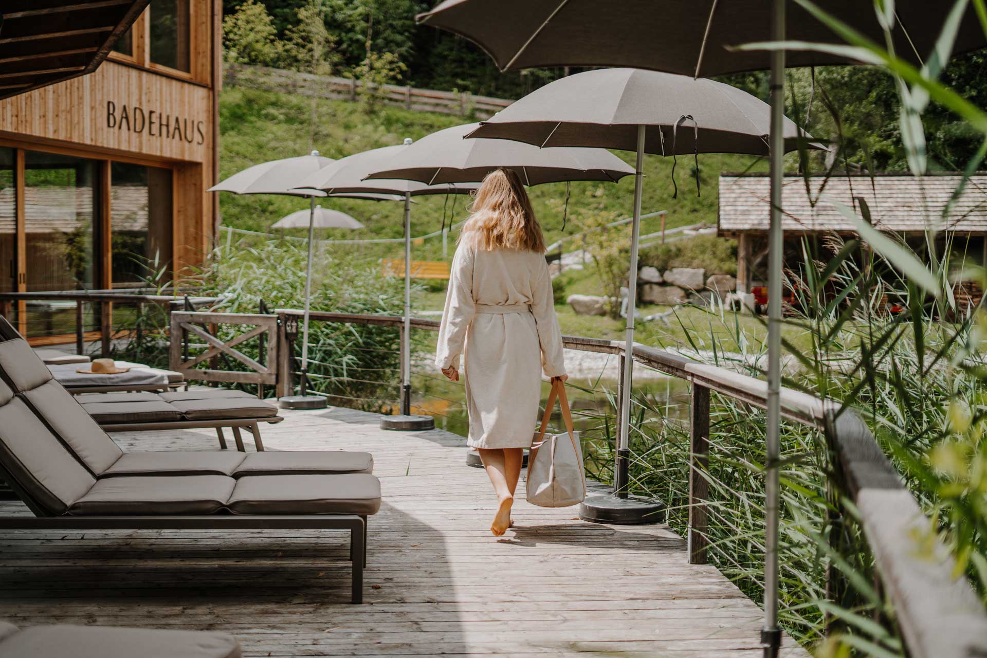 Das neue Badehaus direkt am Seerosenteich schmiegt sich harmonisch in die idyllische Landschaft des Weilers Maria Saalen ein: Erdige Naturtöne, handgespachtelte Wände und Böden, einheimische mondgeschlagene Fichte, große Glasfronten, luftige Räume mit edlen Materialien und natürlichen Textilien. Neben den großzügigen Saunen und Ruhebereichen lädt der neue Indoor-Naturpool auch an regnerischen Tagen dazu ein, die natürliche Atmosphäre in vollen Zügen zu genießen.
